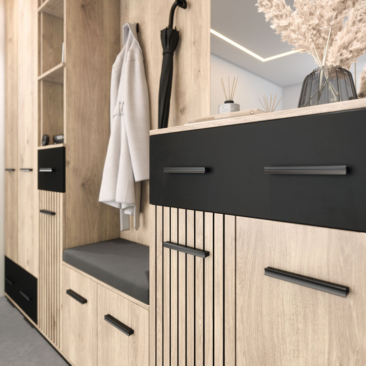 O štýlový dizajn Vašej vstupnej časti sa postará moderná predsieňová zostava . Kombinácia moderných farieb a predných dvierok imitujúcich trendové lamely jej dodáva jedinečný charakter.