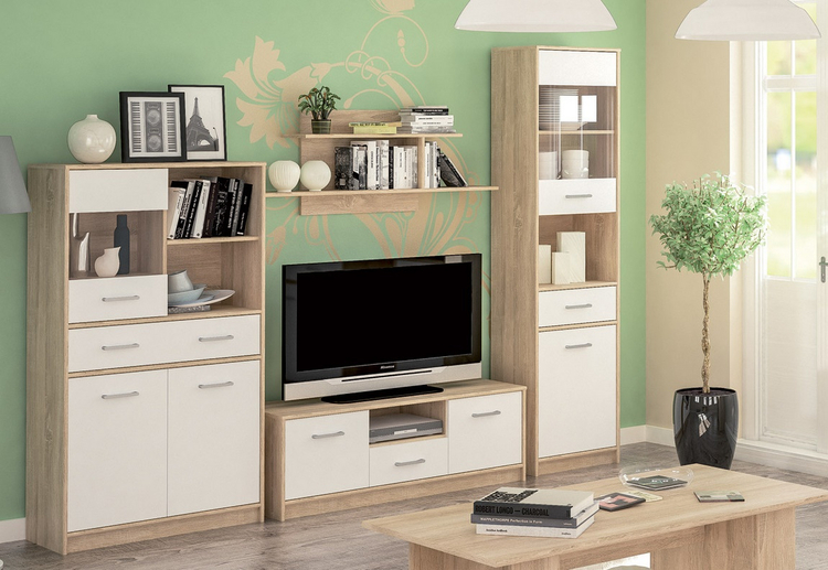 Zostava do obývacej izby v modernom prevedení vyrobená z kvalitnej LTD dosky vo farebnej kombinácii dub sonoma / biela mat. Vzorová zostava obývačky sa skladá z: (š/hl(v) TV stolíka 2D1S (123 x 38 x 42 cm),police (120 x 22 x 45 cm),skrinky 1V2D1S (83 x 34 x 144 cm) a vitríny 1V1D 50 x 34 x 195 cm) Ponuka komponentov tohto sektorového radu umožňuje zostaviť si nábytok do obývacej, detskej alebo študentskej izby podľa vlastných predstáv.Dodávame v demontovanom stave.CASA 97012